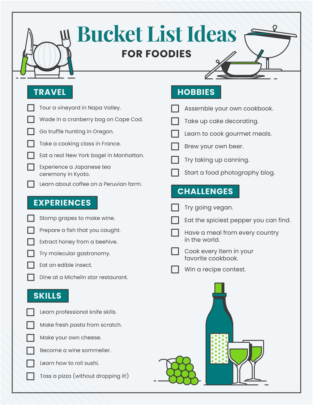 This bucket list includes activities for both foodies and beverage enthusiasts. It also includes some kitchen and cooking skills you may have considered mastering in the past. Not only can learning a new skill in retirement keep your days interesting, but also setting goals and establishing regular practice or classes can help retirees reestablish routines, which in turn can help improve mental health and wellbeing.