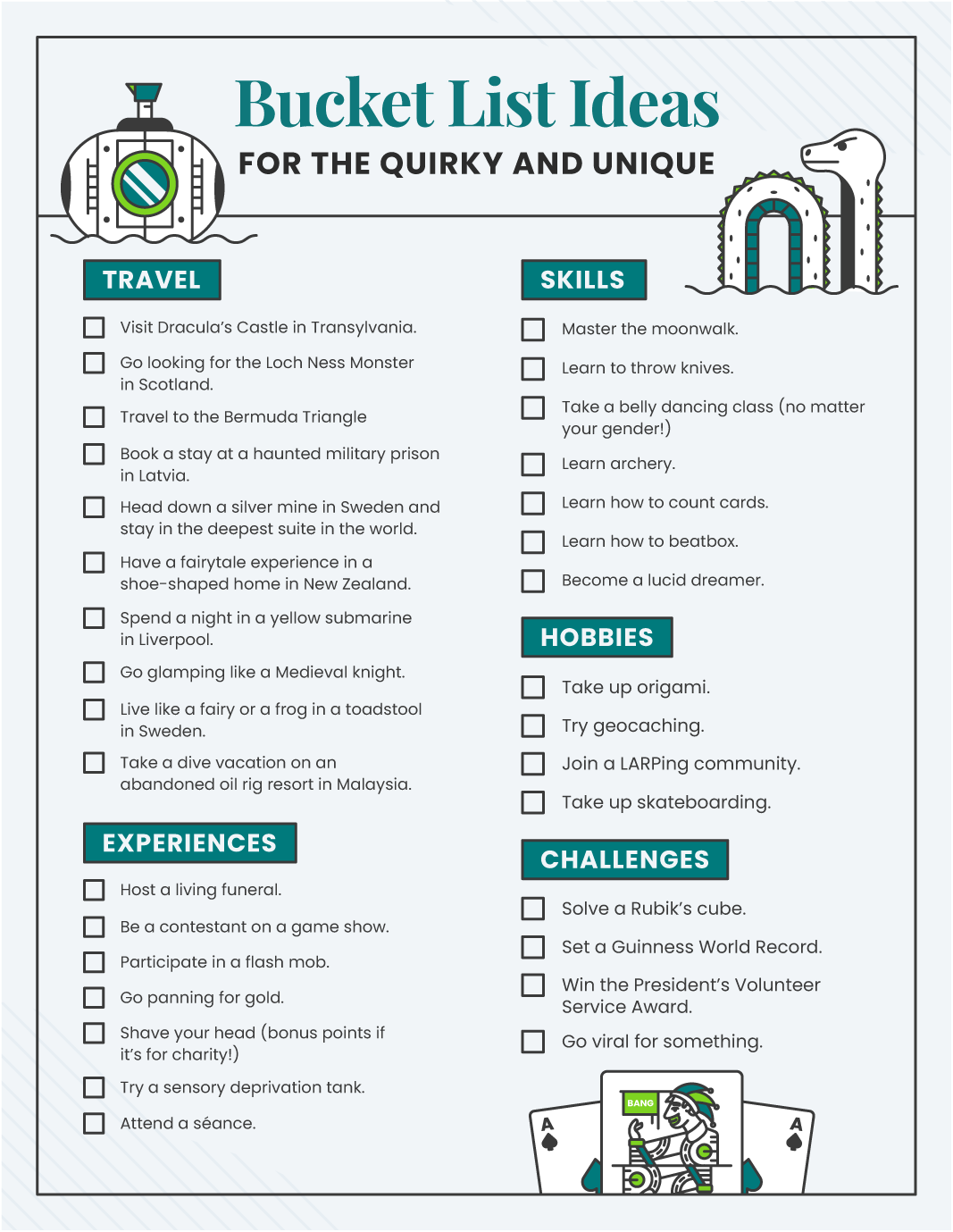 A bucket list is a great motivator to pursue our hopes and dreams. It helps us evaluate our values and goals and reminds us of what’s important.