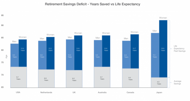 The apprehension is justifiable, according to a white paper by the World Economic Forum, which found that American men can expect to live an estimated 9.6 years longer than their retirement savings will last, while American women can expect a gap of 12.2 years. The report looked at six countries with major economies and found these gaps in all of them. The United States had the smallest gap. The worst was in Japan, where women can expect to outlive their savings by 19.9 years, and men have a gap of 15.1 years. In every country, the report concluded, women bear the biggest brunt of the shortfall, as they tend to outlive their savings by an average of two years longer than men.